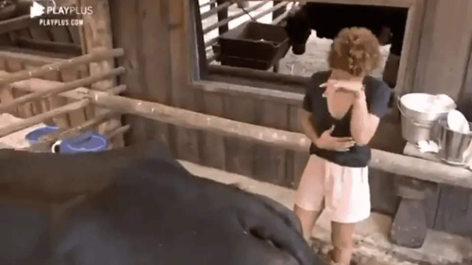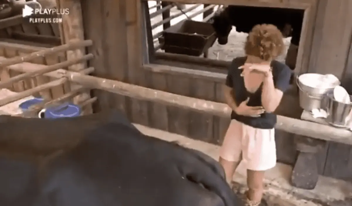A atriz chegou animada no curral, até deu um beijinho na vaca, porém a felicidade durou pouco. Antes de começar a tirar leite do animal, a peoa começou a chorar.