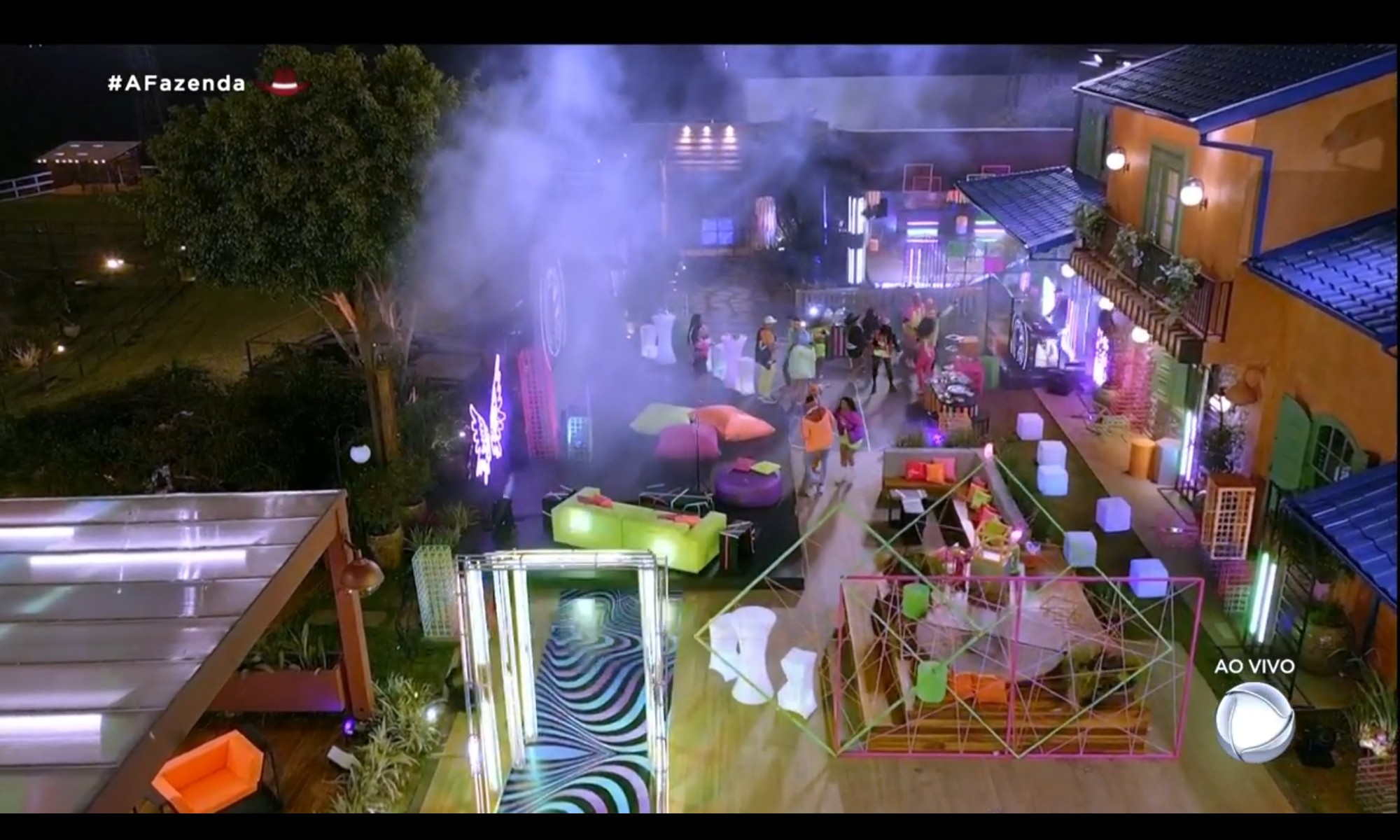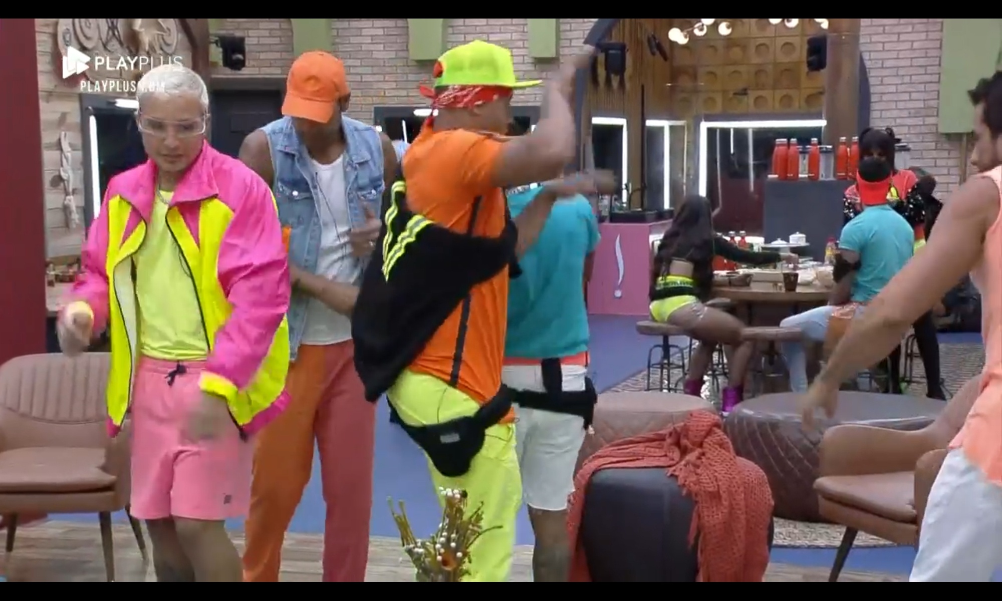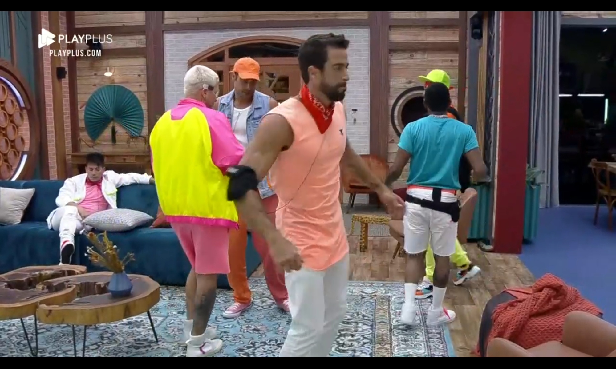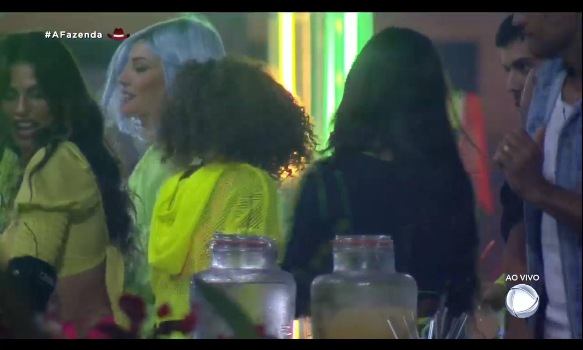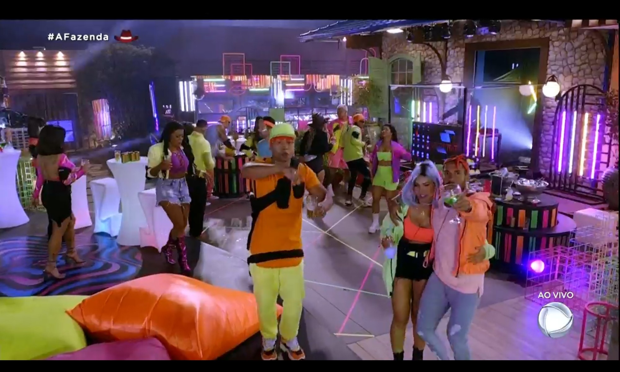 Como os peões estavam animados para a festa da Fazenda nesta semana, a produção tocou músicas antes mesmo do início do evento, o que fez o elenco dançar na sala. Nos looks, o elenco do programa vestiu cores fortes e chamativas, caracterizados com neon.