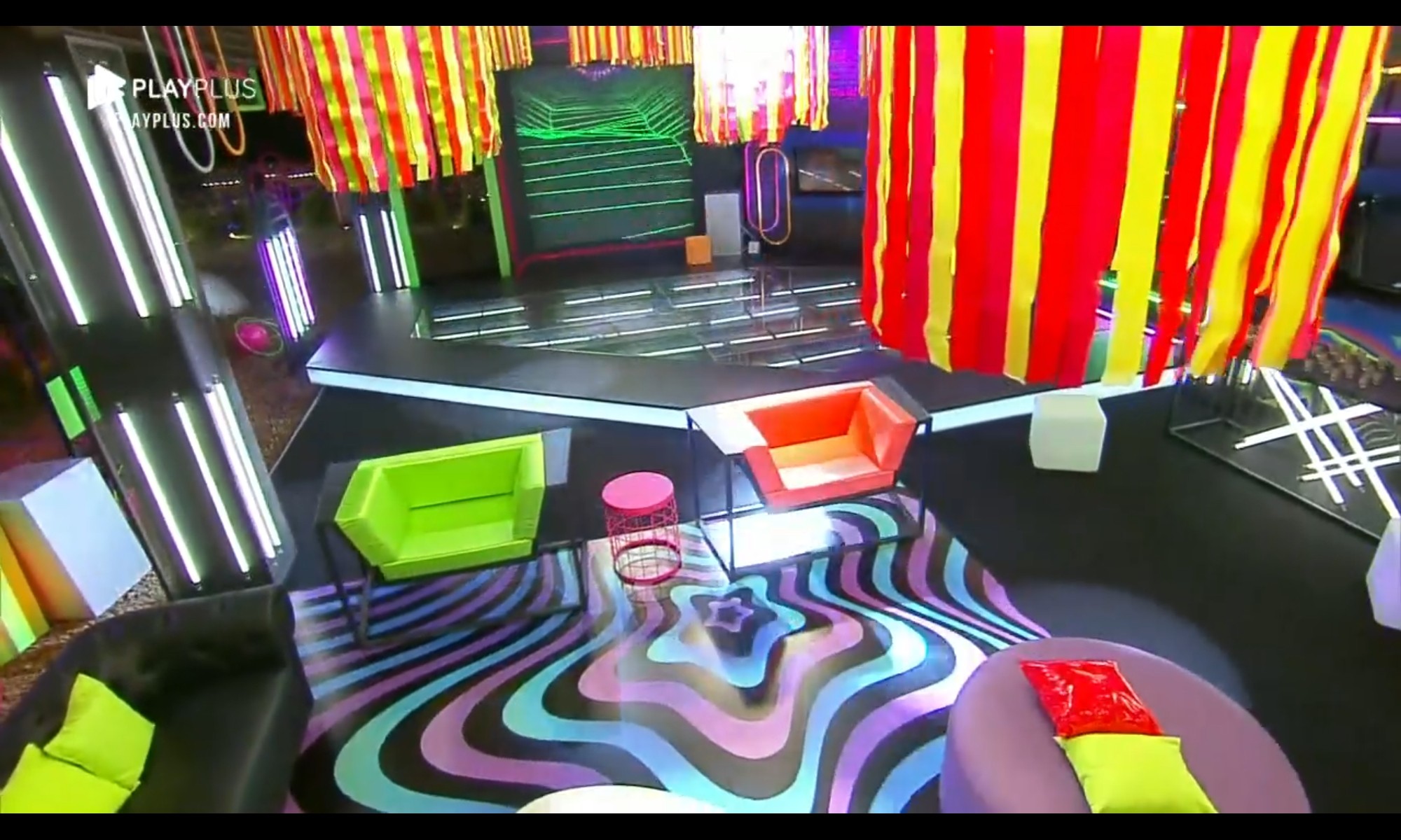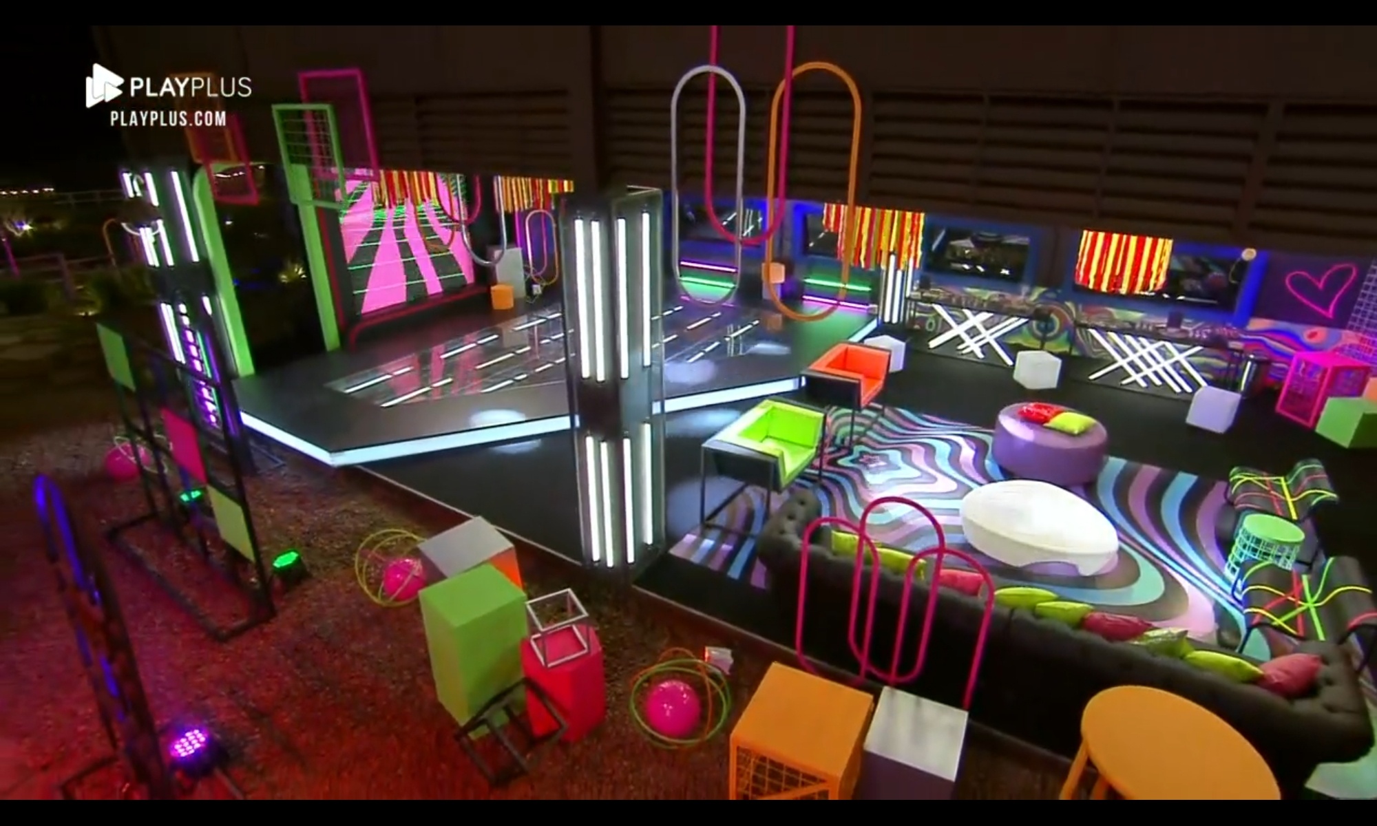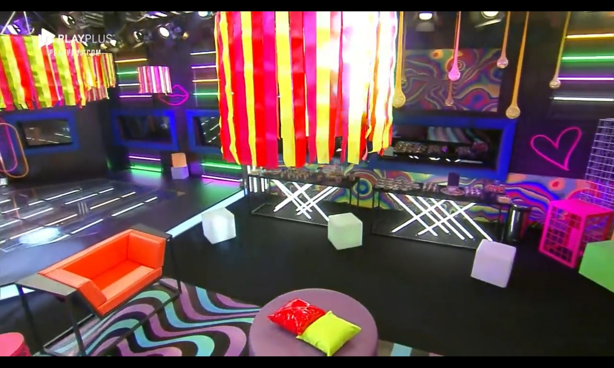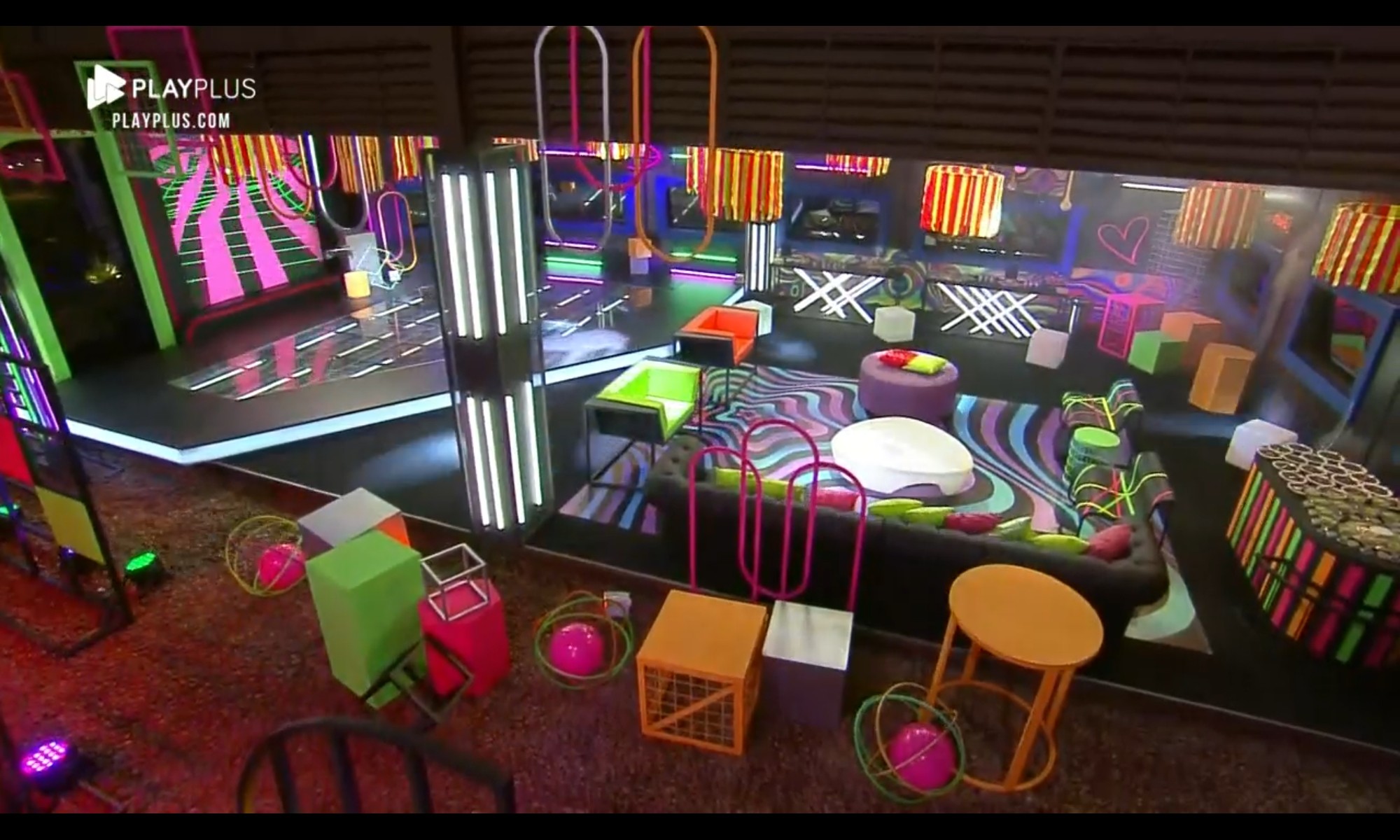 Na decoração, elementos igualmente coloridos, também seguindo a proposta neon. Bruno Martini, a atração do evento, estava dentro de uma caixa de vidro – seguindo os protocolos sanitários contra a Covid-19.
