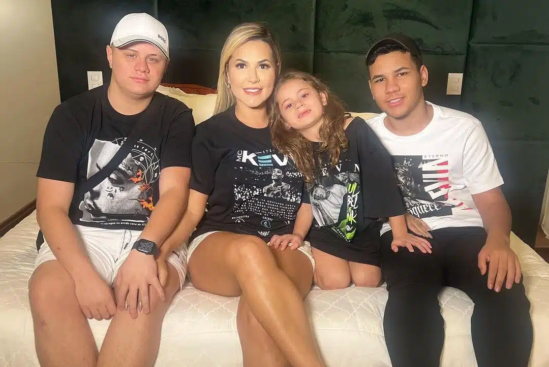 Recentemente, ela publicou um clique raro ao lados três filhos usando camisetas em homenagem a Kevin – advogada fez a publicação após não ter sido convidada pela família do funkeiro para o lançamento das peças.