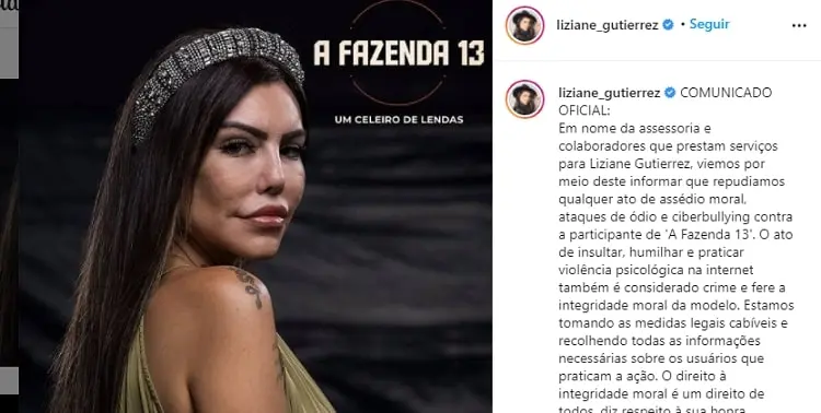 Na tarde do mesmo dia, a assessoria de Liziane resolveu soltar uma nota oficial sobre o assunto: “viemos por meio deste informar que repudiamos qualquer ato de assédio moral, ataques de ódio e ciberbullying contra a participante de ‘A Fazenda 13’. O ato de insultar, humilhar e praticar violência psicológica na internet também é considerado crime e fere a integridade moral da modelo. Estamos tomando as medidas legais cabíveis e recolhendo todas as informações necessárias sobre os usuários que praticam a ação. O direito à integridade moral é um direito de todos, diz respeito à sua honra, liberdade, imagem e nome”.