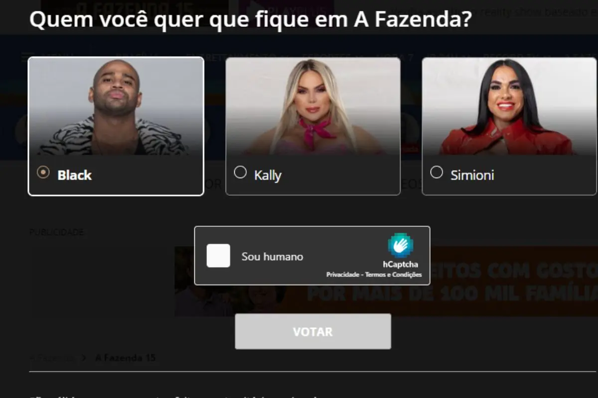 O primeiro passo para conseguir votar pelo site é acessando o R7 (https://www.r7.com/). Depois, você vai ir até a aba oficial de “A Fazenda 15” no canto superior direito ). Clique na enquete “Quem você quer que fique em A Fazenda?” no começo da nova página e selecione quem você quer salvar entre Kally, Simioni e Cezar Black.