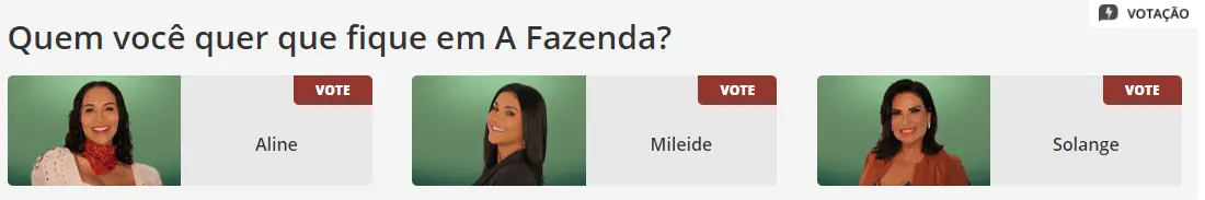 A enquete do UOL também aponta para um resultado similar. Mileide e Solange estão praticamente empatadas, com 35,99% e 35,97%, respectivamente. Aline aparece em terceiro lugar com 28,04%.