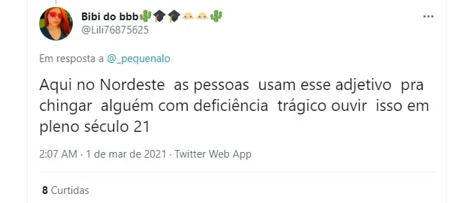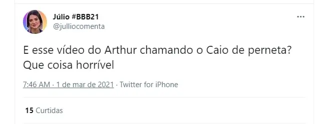 Na internet, o brother do BBB 21 foi bastante criticado por usar a palavra “perneta”. “Acabei de ver o Arthur usando o termo ‘perneta’ pra xingar o Caio! Ele sendo super capacitista ao xingar, dizendo que o próprio (Arthur) também tá com a mobilidade reduzida no braço, é cada uma viu gente”, reclamou a influenciadora digital Pequena Lo no Twitter.