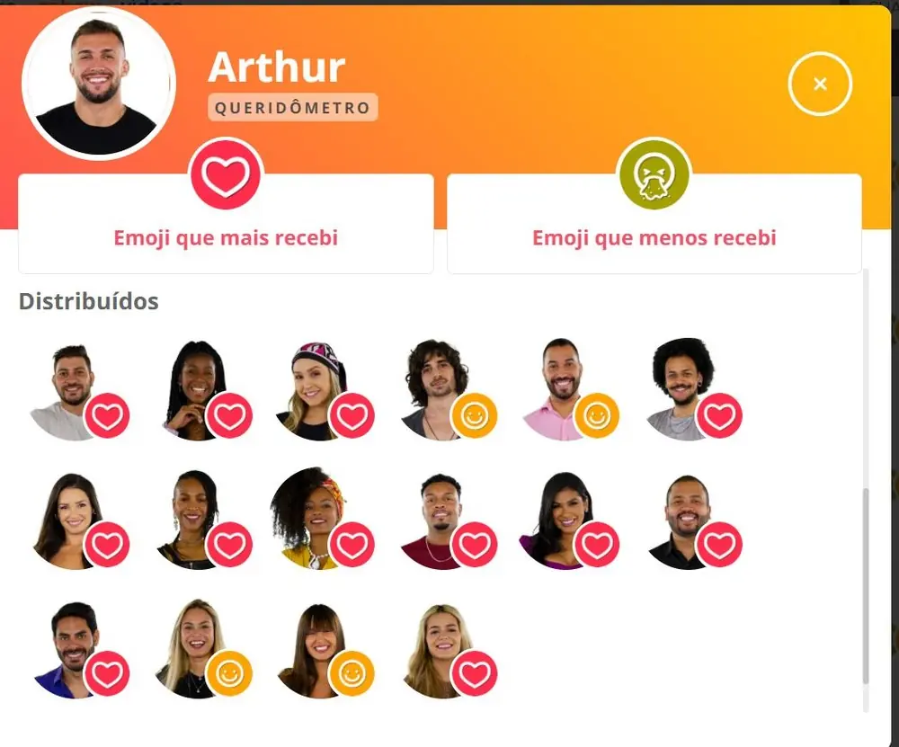 - Arthur foi o participante que mais recebeu corações partidos no queridômetro do BBB, um total de 21