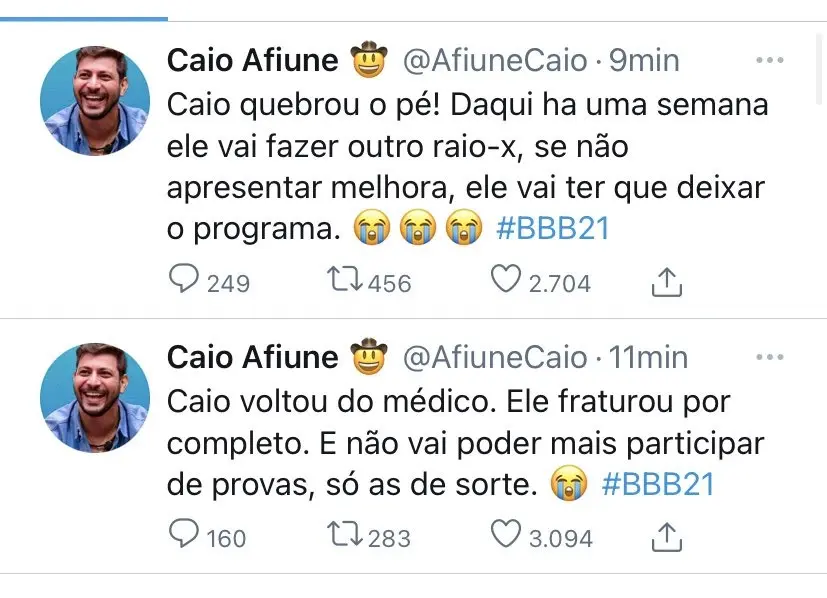 Após sofrer uma fratura durante a prova do líder na quinta, Caio confirmou nesta sexta-feira, 19, que quebrou o pé esquerdo no BBB21. Agora, o fazendo não poderá participar das provas e ficará com o membro imobilizado por até 8 semanas.