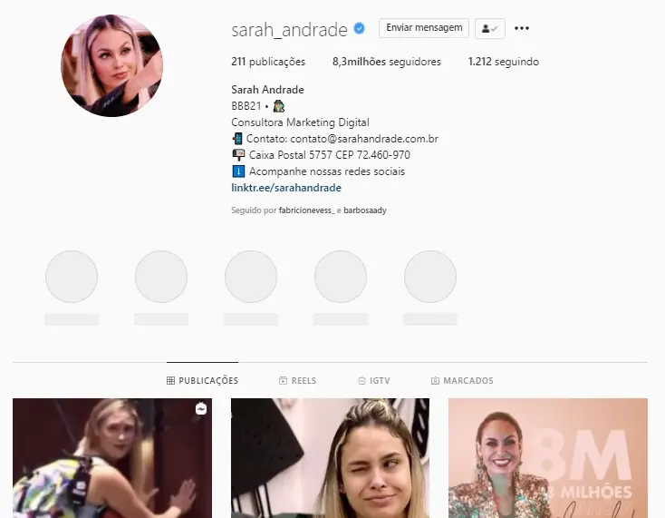 Sarah fica em terceiro lugar com 8,3 milhões de seguidores no Instagram.