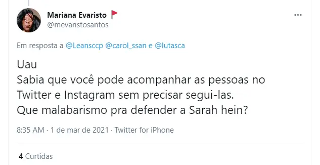 Outra parte do público considerou que a participante do BBB21 seguia Bolsonaro para ficar informada dos passos do presidente da república e do comportamento na web, já que Sarah trabalha com mídias sociais. Desde a madrugada (1) o assunto tem rendido nas redes e gerado debate.