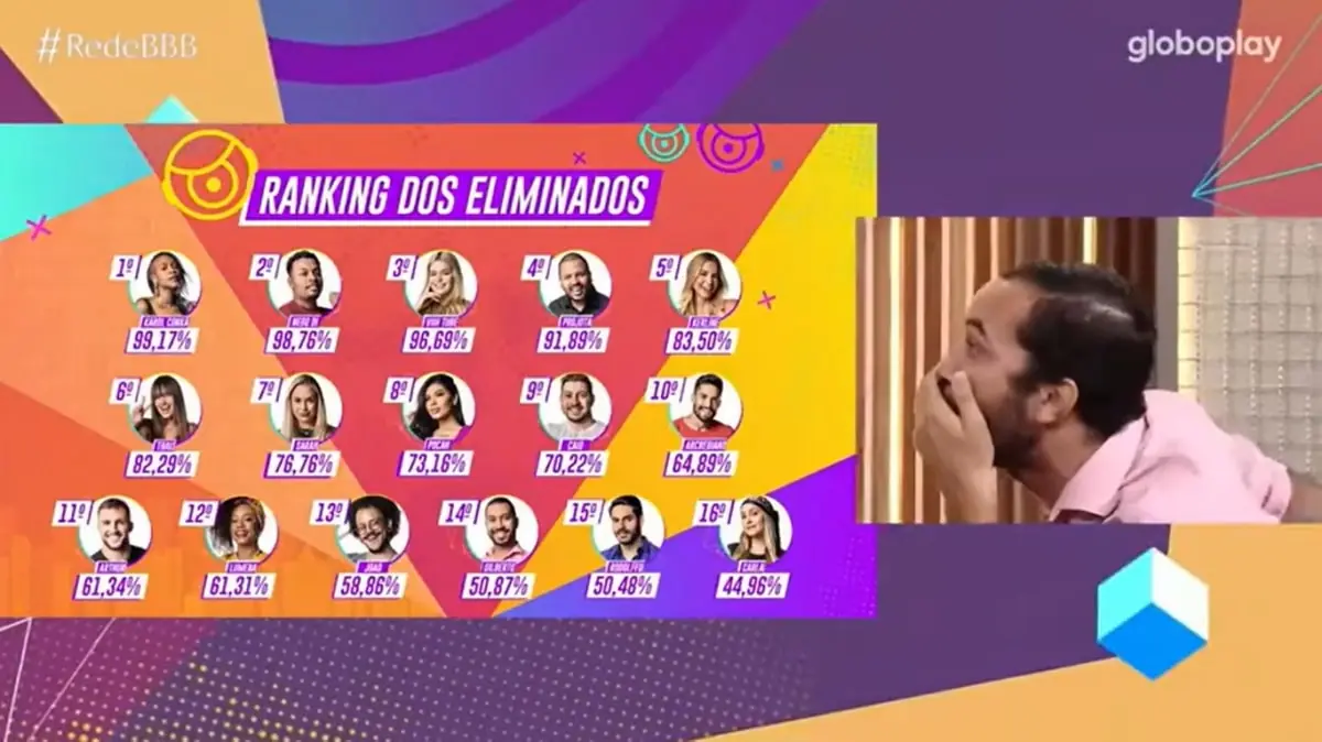 A apresentadora do Bate-Papo BBB mostrou para o recém-eliminado um ranking com todas as eliminações da temporada, indicando a porcentagem que cada participante recebeu para sair do programa. Alguns números, como o de Karol Conká, deixaram o doutorando em economia chocado.