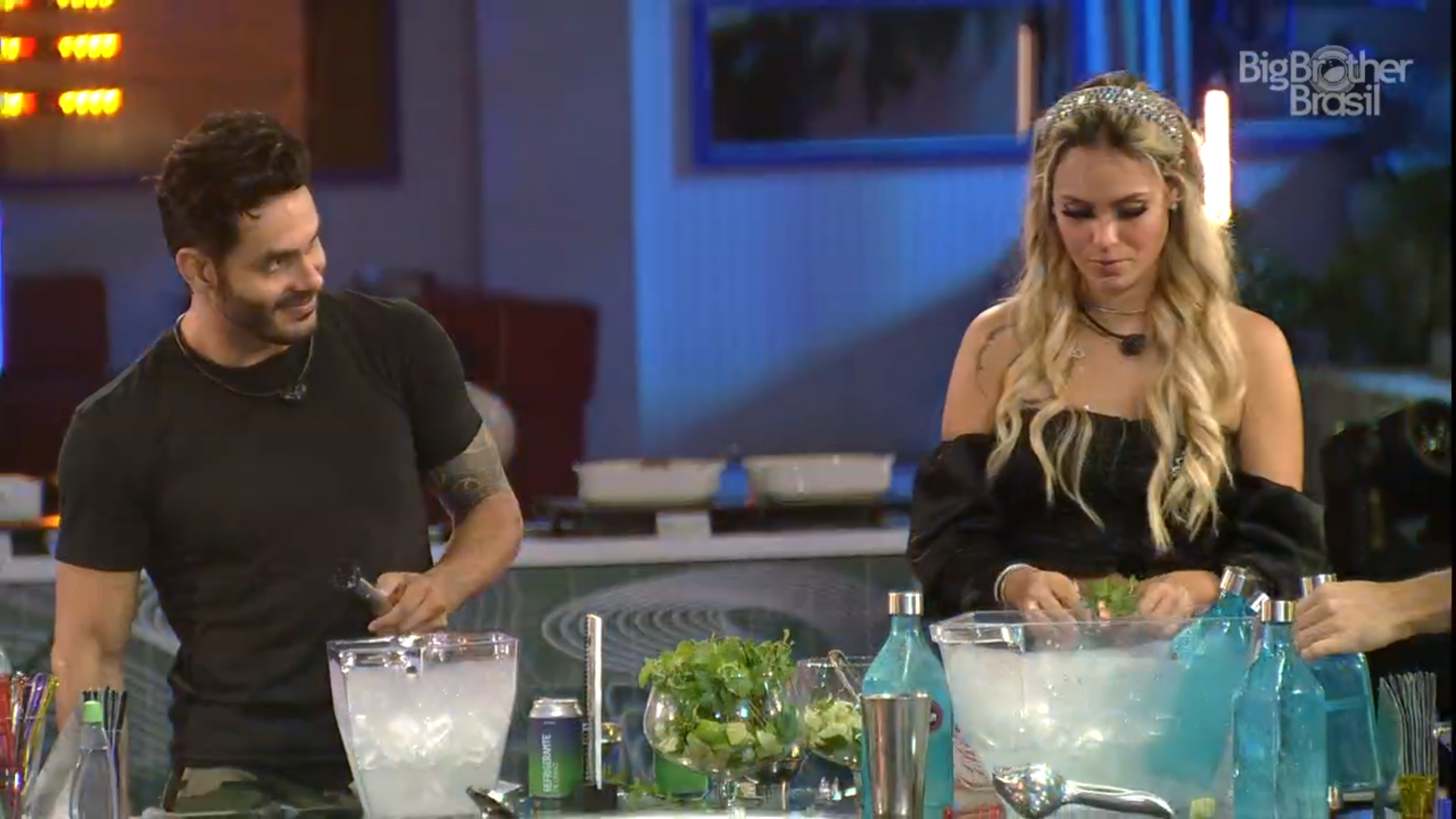 Logo depois, a produção chamou João a despensa para pegar o look da festa e alguns petiscos e bebidas. Alguns participantes fizeram um esquenta na cozinha da casa mais vigiada do Brasil, enquanto Rodolffo optou por descansar no quarto cordel e Viih Tube arrumou o cabelo no banheiro principal.