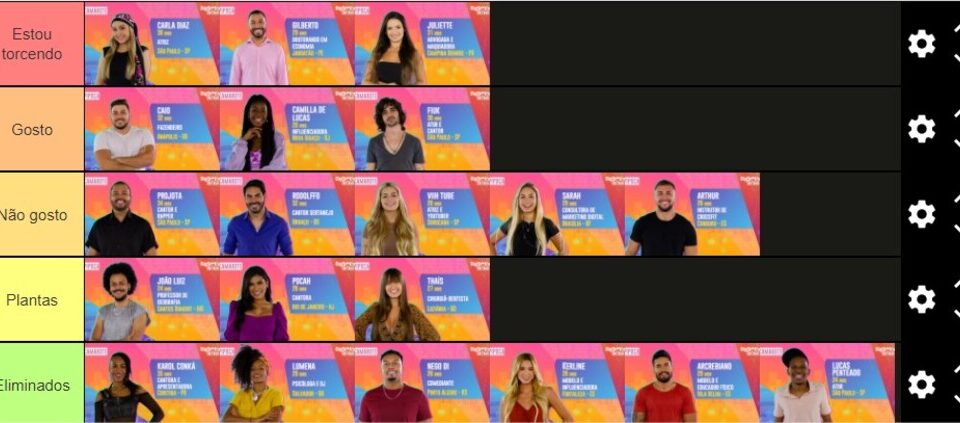 A plataforma funciona de maneira bem fácil e intuitiva. Primeiro, é necessário entrar na página do Tiermarker. Em seguida, será disponibilizada uma tabela com as imagens de todos os participantes.