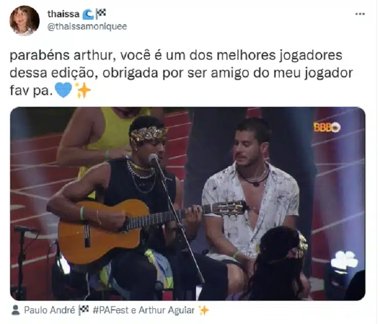 “Parabéns Arthur, você é um dos melhores jogadores dessa edição, obrigada por ser amigo do meu jogador favorito, o P.A”, comentou uma integrante da torcida de Paulo André. “Parabéns Arthur e que de presente você ganhe o líder”, escreveu uma fã do ator.