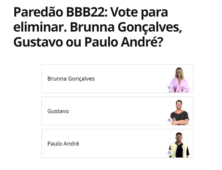 Para tirar Brunna Gonçalves, Gustavo ou Paulo André da disputa pelo prêmio de R$ 1,5 milhão, é necessário votar. A enquete oficial do programa é disponibilizada no Gshow e você pode votar quantas vezes quiser, não há limites por conta ou IP, a quantidade é livre para qualquer um.O primeiro passo para quem nunca participou da votação de um paredão do BBB 22 é criar uma conta no Gshow. É preciso informar nome completo, data de nascimento, gênero, cidade, estado e país em que mora, além de um e-mail válido que servirá de login. Você também terá que criar uma senha e por último passar pela verificação de robôs ao selecionar a caixinha “sou humano”, além de aceitar os termos de uso do site.Quando já estiver logado no site do Gshow, é só clicar na enquete de votação do BBB 22 na página do reality show e em seguida selecionar o nome de quem deve sair do reality show. Passe pela verificação de robôs e aguarde a confirmação do voto.Que horas encerra a votação?A votação será encerrada durante o programa ao vivo desta terça-feira. Enquanto a edição estiver no ar, a enquete do BBB 22 ainda estará disponível no site do reality show. Perto do final do programa de hoje, o apresentador Tadeu Schmidt irá informar ao público que a votação foi encerrada e em seguida fará seu habitual discursos aos brothers, gerando a despedida de um dos três emparedados da semana.