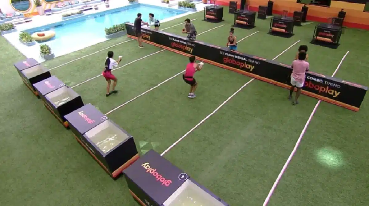 O objetivo da prova do anjo do BBB 22 deste sábado era tirar uma bolinha vermelha de um recipiente no menor tempo possível. Cada dupla ficava de uma lado do gramado, separados por um muro. Um buscava água em um cone e corria até o colega, que pegava a água com seu próprio cone e então levava até um cilindro. Depois que o cilindro estava cheio de água, era necessário tirar a bolinha vermelha e correr até o botão que finalizava o tempo da dupla.