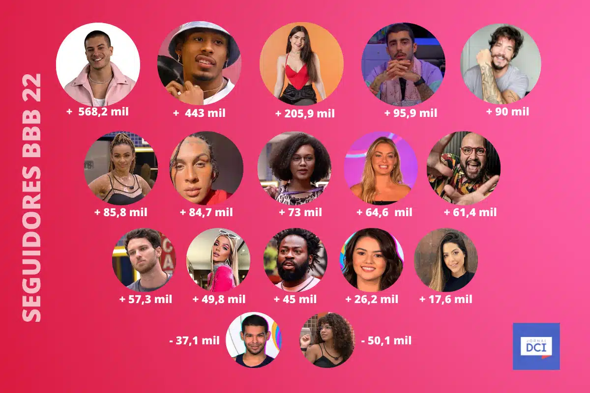 A popularidade dos participantes do Big Brother Brasil pode ser medida pelo crescimento de seguidores do BBB 22 nas redes sociais. Por isso, trouxemos o ranking atualizado de quem ganhou e perdeu fãs no Instagram entre os dias 1 e 8 de fevereiro. Arthur, que se salvou do paredão com folga, lidera a lista.
