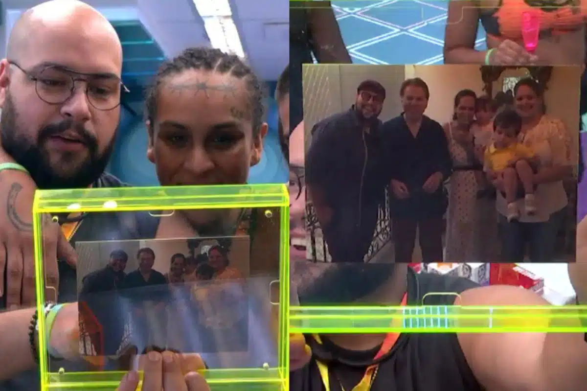 As imagens mostram o brother ao lado de parentes por parte de mãe e de pai, e em uma delas está Silvio Santos. Linn da Quebrada, Pedro Scooby, Arthur Aguiar e Douglas Silva, que entraram no cômodo junto com Tiago, também se empolgaram com a fotografia.