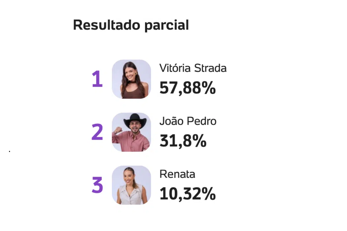 O último paredão foi formado no BBB 25 e Vitória, João e Renata disputam a preferência do público para chegar na grande final. Quem vai sair? Veja o que diz a parcial da Votação enquete UOL neste sábado, véspera do resultado.