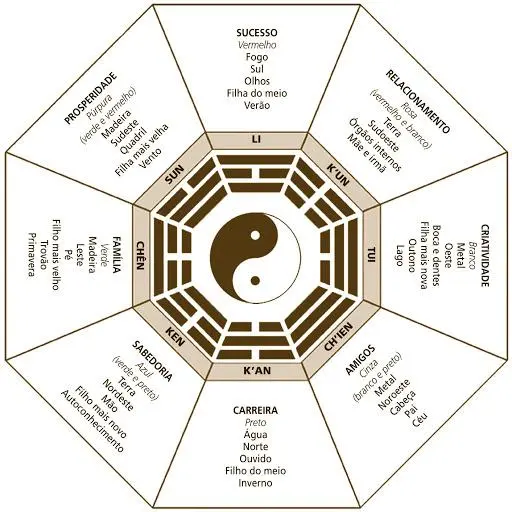 São oito áreas: família, prosperidade, fama, relacionamento, criatividade, amigos, carreira e sabedoria. O centro do baguá representa o equilíbrio das forças yin e yang, a harmonia. Veja como usar o baguá: