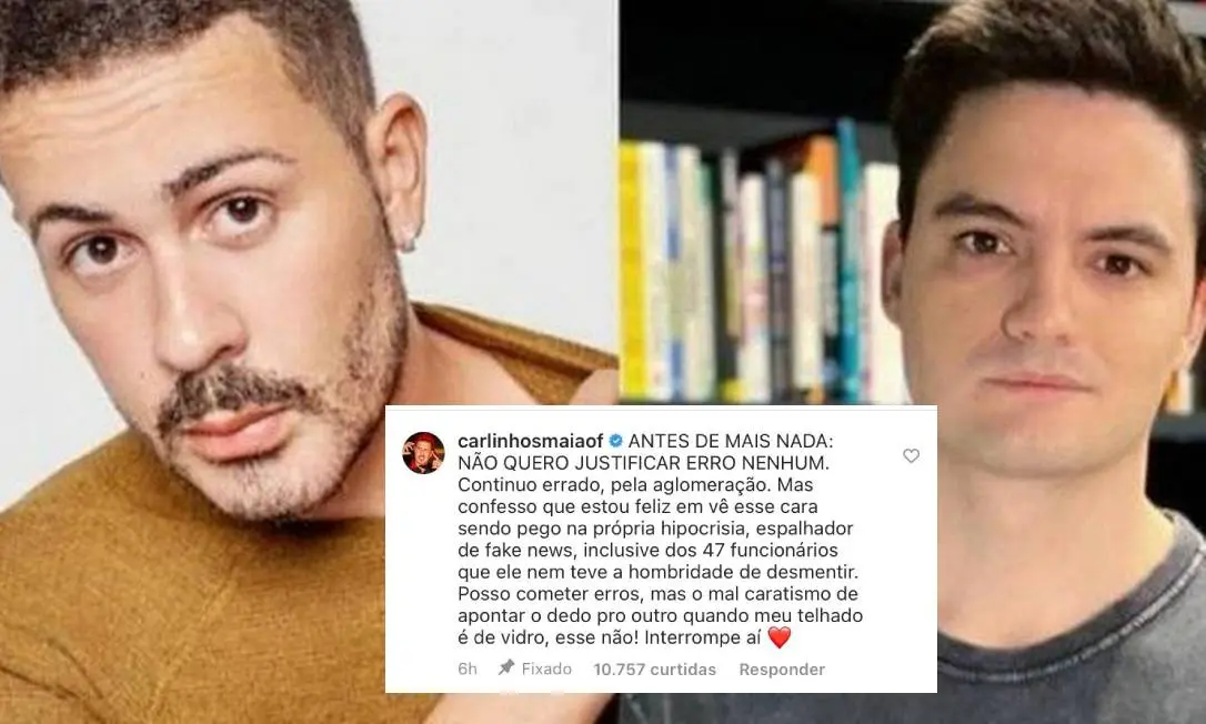 “Antes de mais nada: não quero justificar erro nenhum. Continuo errado, pela aglomeração. Mas confesso que estou feliz em ver esse cara sendo pego pela própria hipocrisia, espalhador de fake news, inclusive dos 47 funcionários que ele nem teve a hombridade de desmentir. Posso cometer erros, mas o mau caratismo de apontar o dedo pro outro quando meu telhado é de vidro, esse não!”, escreveu o humorista.