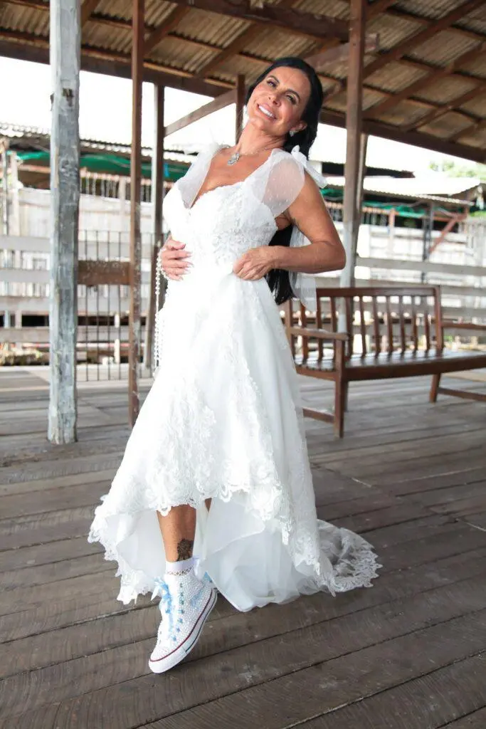 Para o look do grande dia, Gretchen apostou no tradicional vestido branco, da grife espanhola Rosa Clará, mas dispensou o véu e o salto alto, trocando o sapato por um confortável par de tênis. O noivo, por sua vez, usou branco dos pés à cabeça.