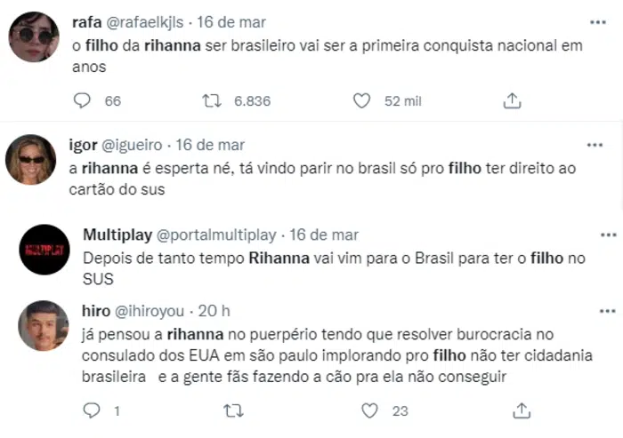 “Torcendo muito pro filho da Rihanna nascer no Brasil porque mesmo ele não tendo parentes ou qualquer coisa por aqui a gente sempre vai poder falar que sim ele nasceu brasileiro”, escreveu um internauta. “A Rihanna quer q o filho dela seja tudo MENOS estadunidense”, brincou outro fã.
