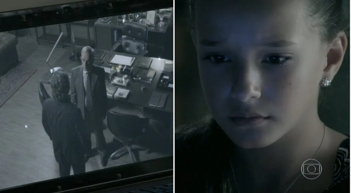 Mas o que ela encontra a deixa mais surpresa, ao abrir a tela do notebook do vilão, Bruna descobre que Maurílio está espionando José Alfredo na novela Império. A menina assiste a câmera da sala do comendador no momento em que o protagonista está em uma reunião com Cristina.