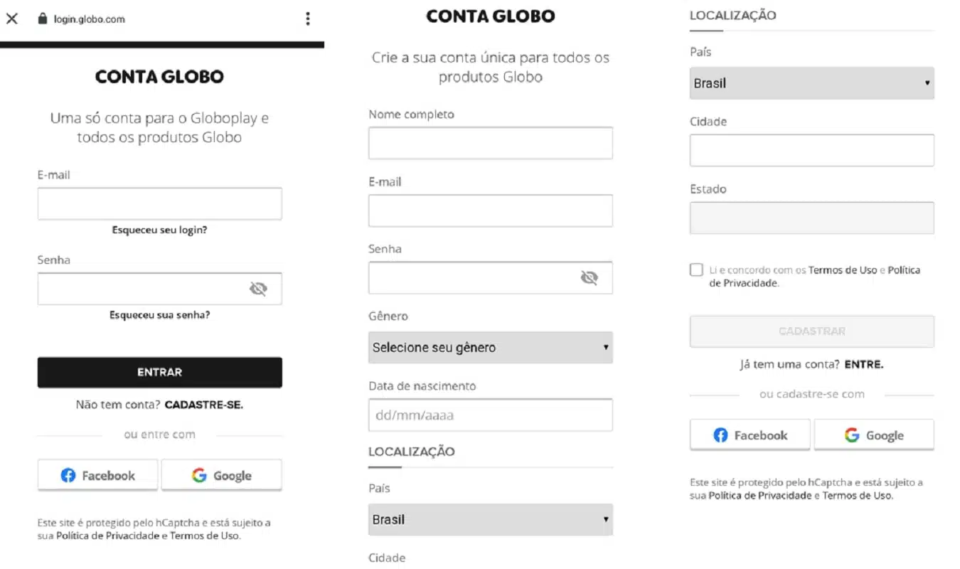 Acesse o site (https://globoplay.globo.com/) e depois clique em “entrar” na aba superior direita. Em seguida, você vai ver o botão “Não tem conta? Cadastre-se” na parte de baixo, clique nele e você será redirecionado a uma nova página. Agora, será preciso informar nesta etapa algumas coisas sobre você: