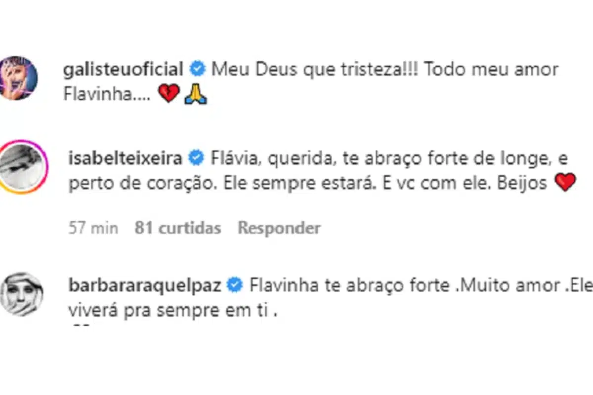 A também atriz Isabel Teixeira, filha do cantor Renato Teixeira – que já se apresentou no programa – e que vive atualmente Maria Bruaca em Pantanal, comentou: “Flávia, querida, te abraço forte de longe, e perto de coração. Ele sempre estará. E vc com ele. Beijos”.