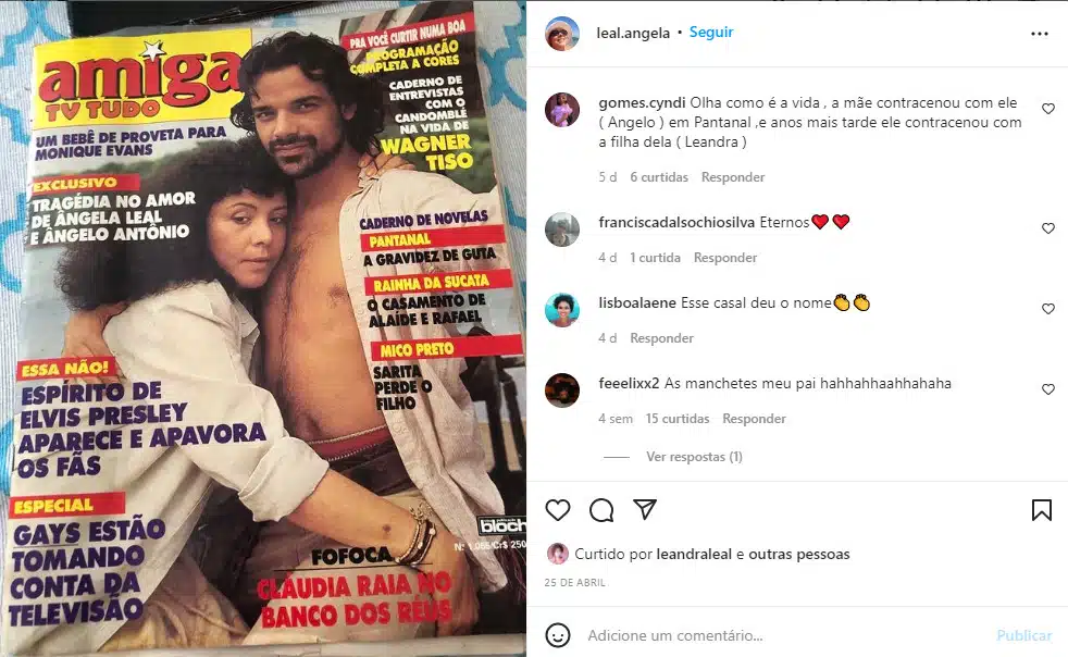 Em abril, a atriz publicou uma revista antiga em que aparece ao lado de Ângelo Antônio e relembrou que o ator também foi par romântico de sua filha em O Cravo e a Rosa – Leandra interpretou Bianca e o ator era o professor Edmundo. “Olha como é a vida , a mãe contracenou com ele (Angelo) em Pantanal, e anos mais tarde ele contracenou com a filha dela (Leandra)”, escreveu em sua página no Instagram.