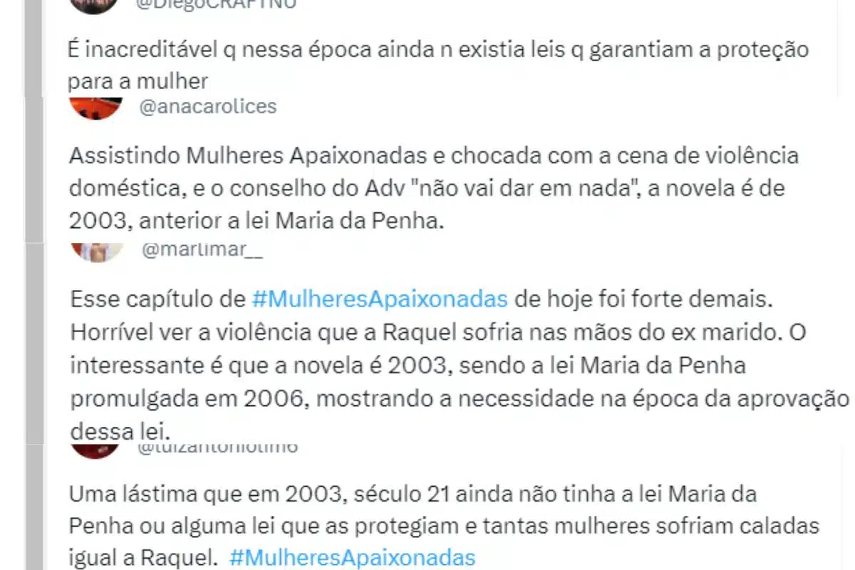 “Esse capítulo de Mulheres Apaixonadas de hoje foi forte demais. Horrível ver a violência que a Raquel sofria nas mãos do ex marido (…) mostrando a necessidade na época da aprovação dessa lei”, opinou outro. “Uma lástima que em 2003, século 21 ainda não tinha a lei Maria da Penha ou alguma lei que as protegiam e tantas mulheres sofriam caladas igual a Raquel”, também foi comentado na rede social.
