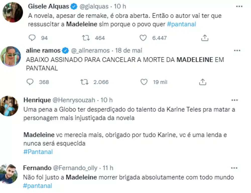 A web reagiu às cenas com infelicidade. “ABAIXO ASSINADO PARA CANCELAR A MORTE DA MADELEINE EM PANTANAL”, publicou a colunista Aline Ramos. “A novela, apesar de remake, é obra aberta. Então o autor vai ter que ressuscitar a Madeleine sim porque o povo quer”, escreveu a jornalista Gisele Alquas.