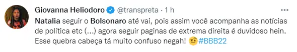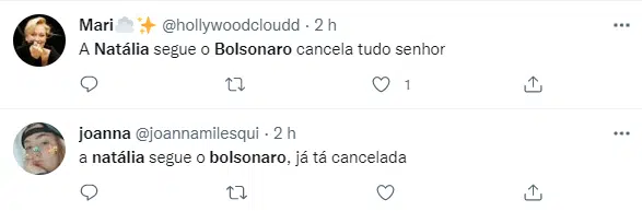 No Twitter, o público não poupou a mineira de críticas. “Natalia seguir o Bolsonaro até vai, pois assim você acompanha as notícias de política etc (…) agora seguir paginas de extrema direita é duvidoso hein. Esse quebra cabeça tá muito confuso negah!”, escreveu a colunista Giovanna Helidoro.