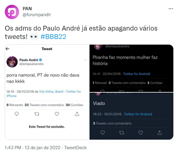Fãs do programa resgataram tweets antigos em que Paulo André do BBB 22 tinha falas preconceituosas, mas as publicações já começaram a ser apagadas pelos administradores do perfil de Paulo André. Em um dos tweets, durante as eleições de 2018, Paulo André disse que “PT de novo não dava não”. Ele também teve falas machistas e homofóbicas.
