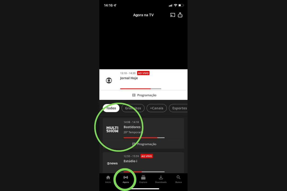 4- Feito o cadastro ou o login, volte para a tela inicial e clique em ‘Agora na TV’ e depois em ‘Multishow’.