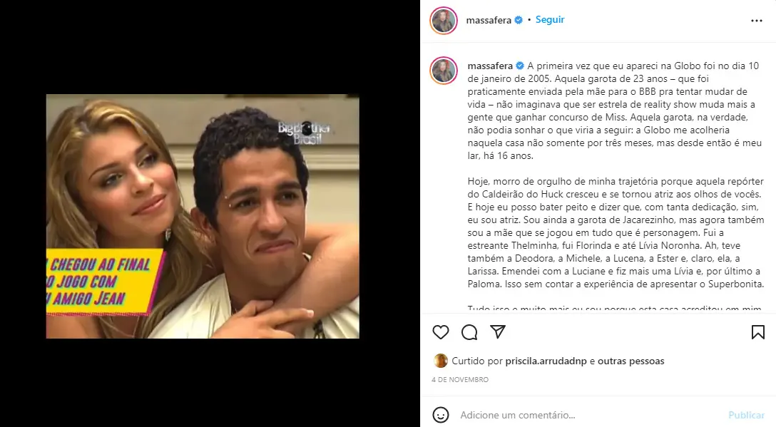 Massafera relembrou os obstáculos que enfrentou e terminou agradecendo a emissora. “Muito obrigado a todos da Globo por este ciclo. Nos veremos muito em breve e nos reveremos em todas as memórias que deixo nesta emissora que é parte de mim, de minha história e de meu coração”.
