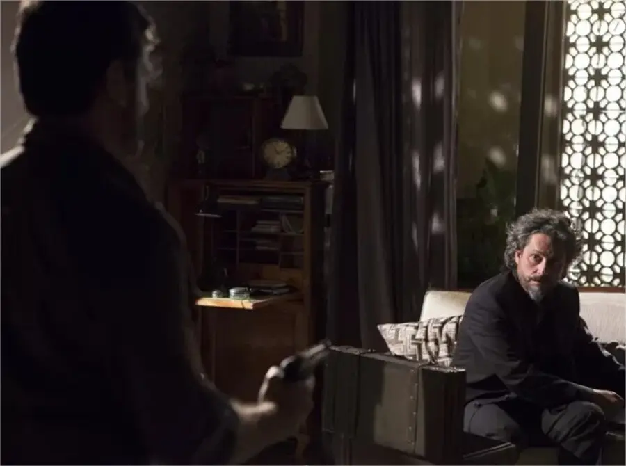 No local, Josué aponta uma arma para o patrão, que se assusta. “Um momento, Comendador. Antes disso, eu preciso dizer que mudei de ideia com relação a um certo assunto”, diz ao sacar a pistola.