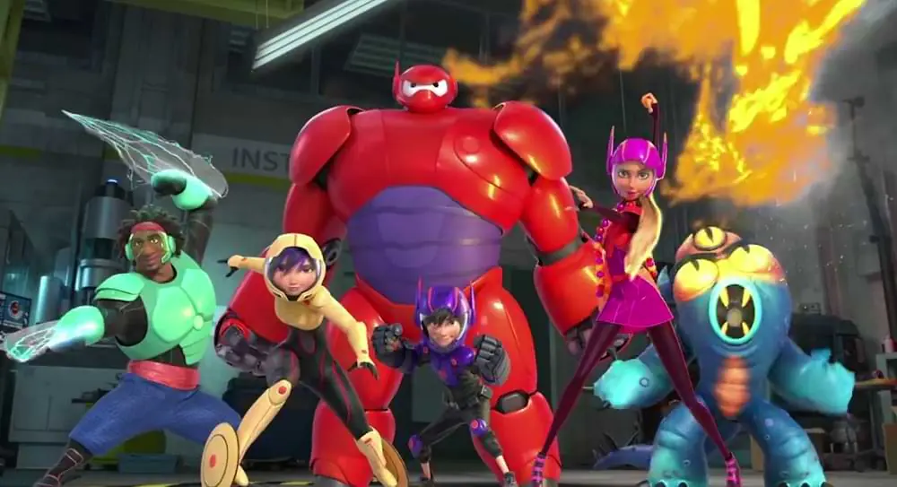 A animação conta a história de um garoto muito inteligente e imerso no mundo da tecnologia robótica que após perder um ente querido, acaba se envolvendo com um grupo de aspirantes à heróis para tentar impedir um grande vilão. O filme ganhou o Oscar de melhor animação em 2015 e tem duração original total de 1h42.