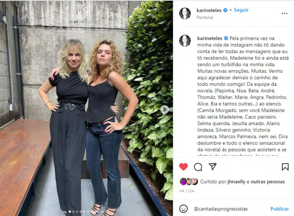 As teorias dos fãs estão incorretas e Madeleine não deve voltar para Pantanal. No último sábado, a atriz Karine Teles se despediu da personagem através de uma publicação no Instagram.