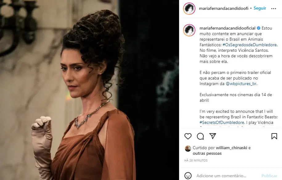 “Estou muito contente em anunciar que representarei o Brasil em Animais Fantásticos: #OsSegredosdeDumbledore. No filme, interpreto Vicência Santos. Não vejo a hora de vocês descobrirem mais sobre ela”, escreveu a famosa. Ainda não há mais informações sobre a personagem, mas no trailer divulgado pela Warner Bros, é possível ver uma imagem da atriz desenhada em uma bandeira. Possível, ela será uma candidata ao cargo de chefia da Confederação Internacional dos Bruxos.