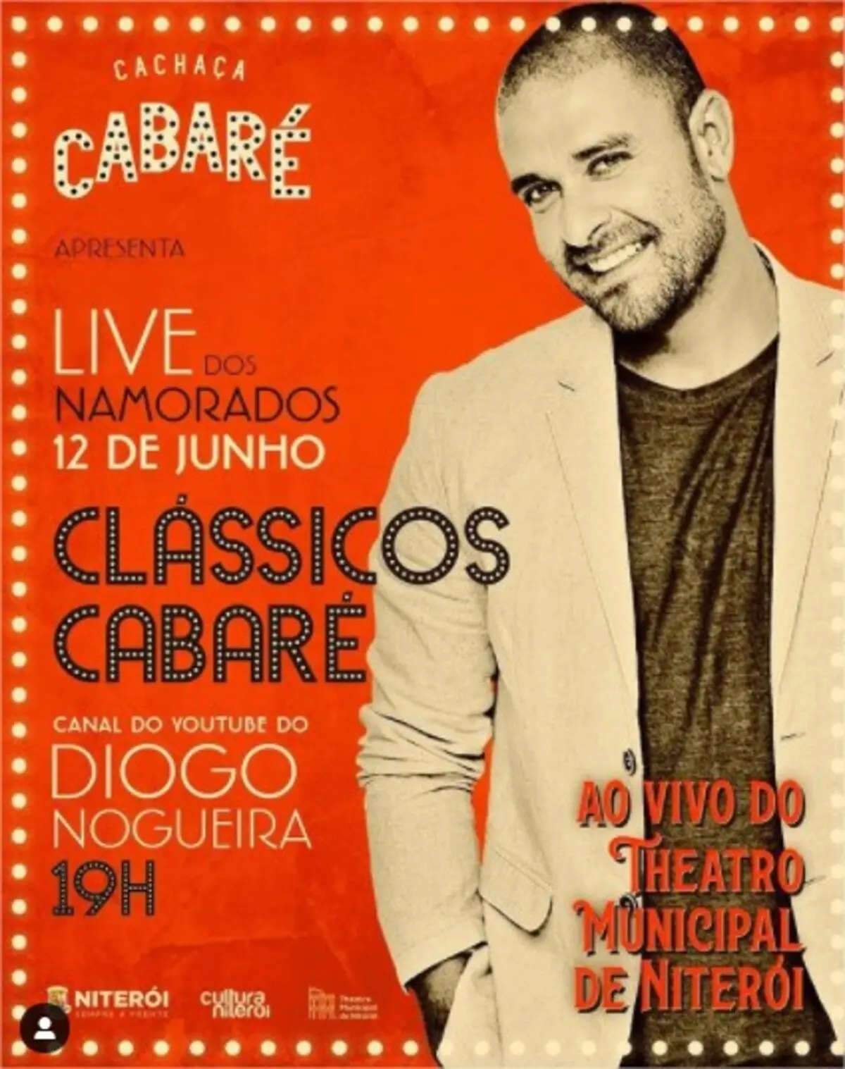 Também há opção para os casais que gostam de samba. A partir das 19h, o cantor Diogo Nogueira comanda a live Clássicos Cabaré, em seu canal do YouTube. A apresentação será transmitida ao vivo do Theatro Municipal de Niterói. “To inspirado, essa LIVE vai ser toda especial!”, escreveu em seu Instagram.
