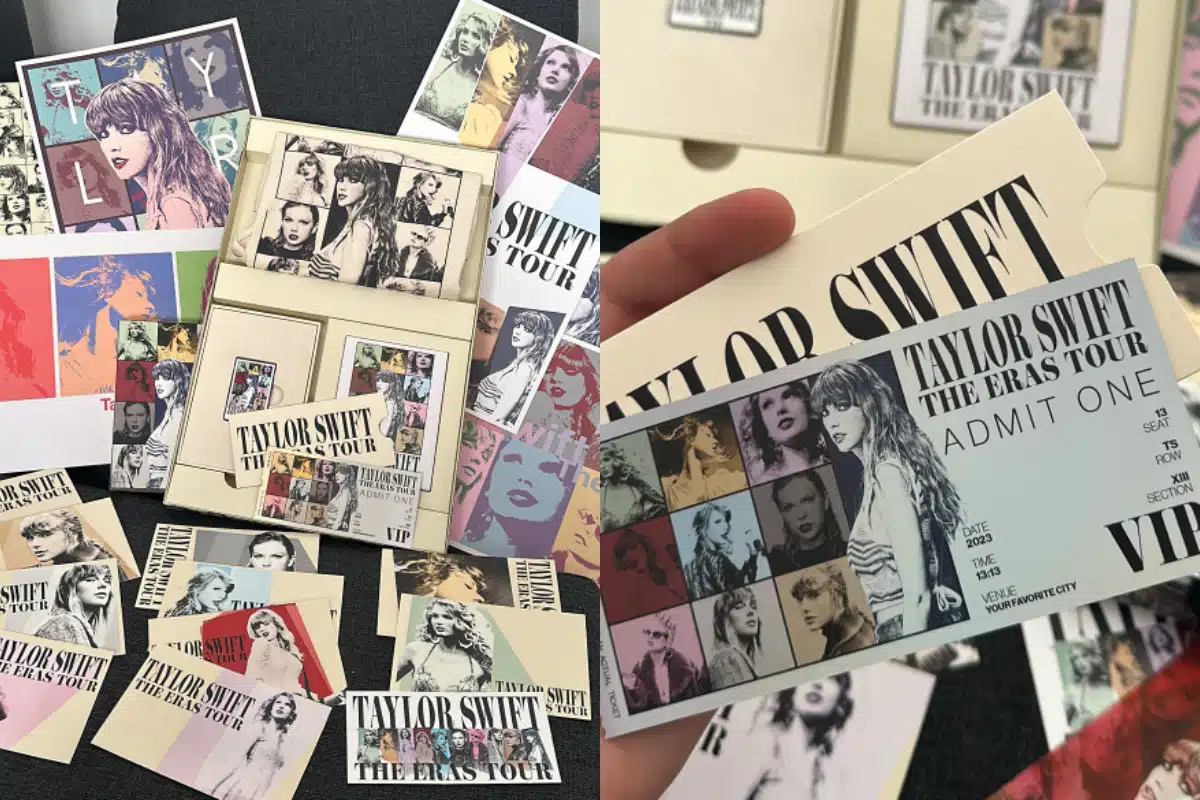 Os fãs que adquiriram os pacotes VIP da The Eras Tour receberão em breve as instruções da T4F para a retirada, que acontece antes das apresentações. Nos Estados Unidos, os fãs que adquiriram os ingressos mais caros receberam: uma bolsa personalizada, um conjunto de adesivos e postais, um pin colecionável, quatro fotos impressas, um cordão LED e um ingresso colecionável holográfico. Os itens podem sofrer alterações em cada país.