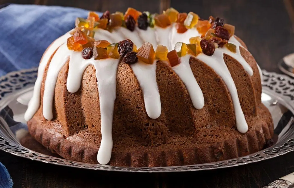 - Retire o bolo do forno, cubra ainda quente com o fondant branco e decore com as nozes e as frutas cristalizadas.