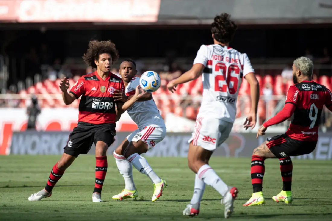 Com um começo avassalador, o Flamengo goleou o São Paulo por 4 a 0 no jogo de hoje, 14, e manteve viva a esperança do tricampeonato. O rubro-negro abriu o placar com 23 segundos de jogo. Após pressão, Liziero perdeu a bola na saída para Andreas, que tocou para Bruno Henrique rolar para Gabigol fazer o primeiro.