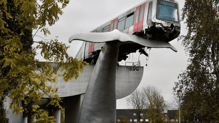 Escultura de rabo de baleia salva trem de queda na Holanda; veja