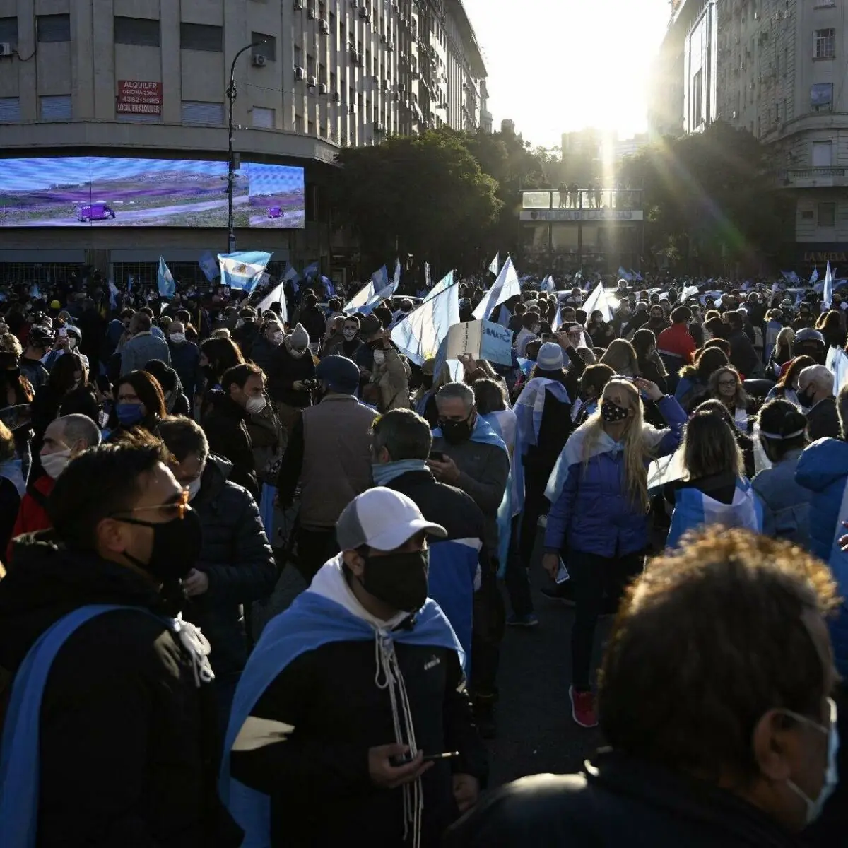 Manifestantes gritando “liberdade, liberdade” se reuniram em torno do Obelisco no centro de Buenos Aires, agitando bandeiras argentinas e entoando slogans antigovernamentais.