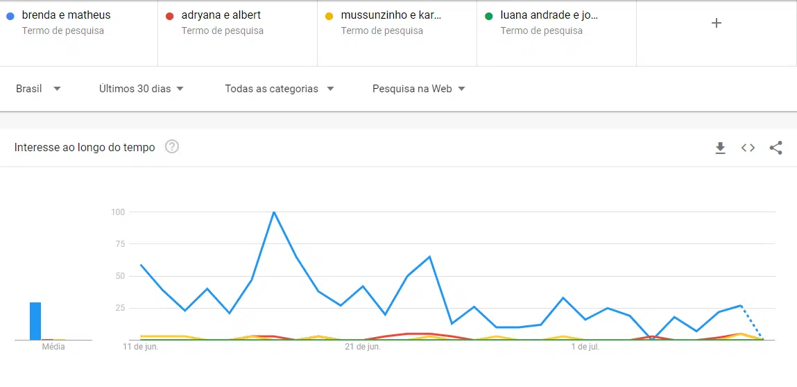 O favoritismo pode ser exemplificado com o número de buscas pelo casal no Google em relação aos outros concorrentes. Brenda e Matheus lideram a quantidade de vezes que cada um dos participantes foram pesquisados na ferramenta nos últimos 30 dias – há baixo interesse por Adryana e Albert, Karoline e Mussunzinho, Luana Andrade e João Hadad.