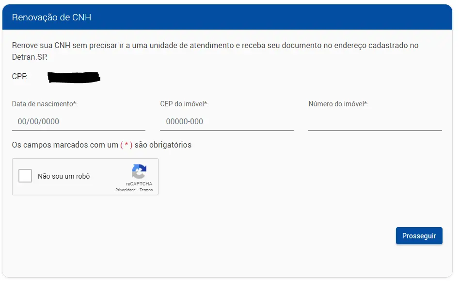 Na próxima tela, o usuário deve inserir as informações de data de nascimento, CEP do imóvel e número de imóvel. Feito isso, clicar no botão azul escrito “Prosseguir”.