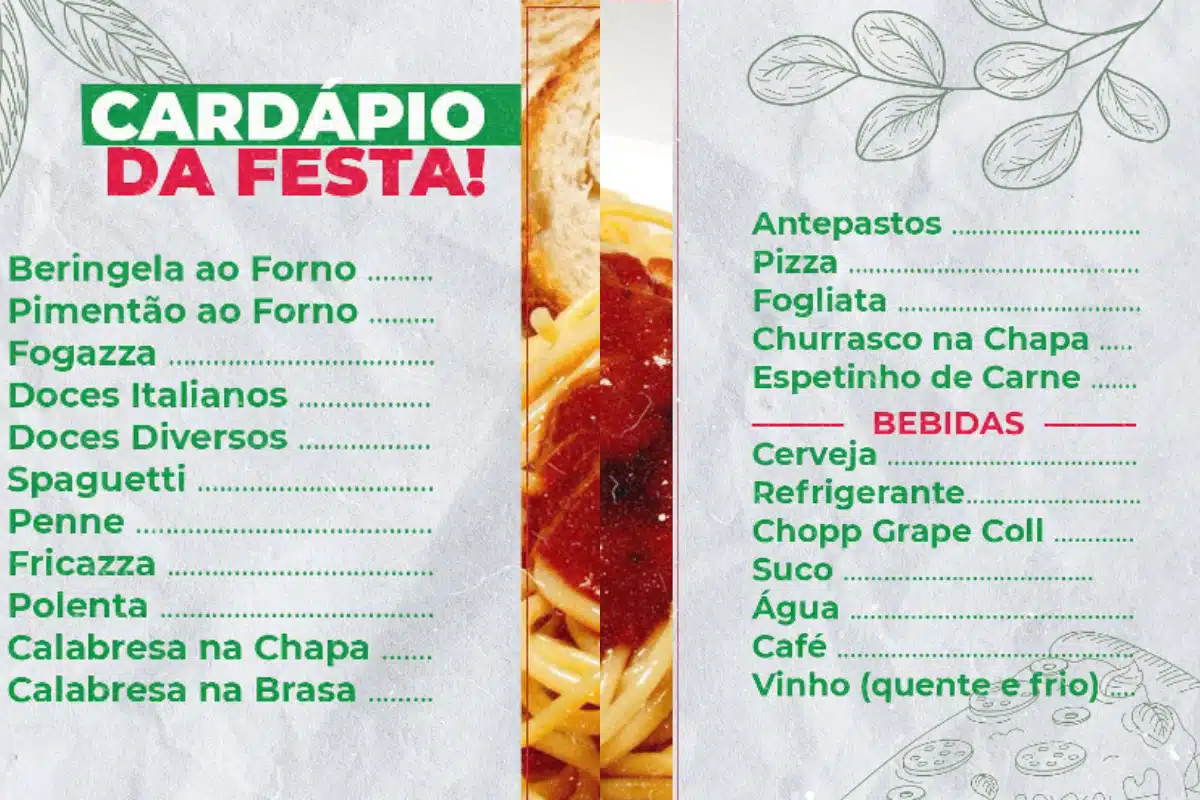 O cardápio da Festa da Achiropita traz pratos tradicionais italianos, que vão do espaguete ao antepasto. Há também opções de doces e bebidas. Os preços variam entre R$ 5 e R$ 30, que são pagos diretamente nas barracas.