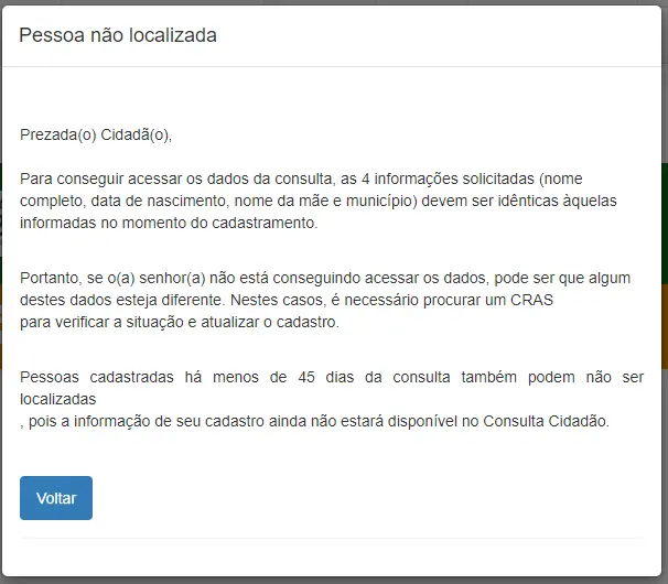 Caso a pessoa que fez a consulta não esteja cadastrada no CadÚnico, aparecerá uma mensagem de “Pessoa não localizada”. O texto explica que as quatro informações solicitadas devem ser iguais àquelas informadas no momento do cadastramento. Nota-se ainda que pessoas cadastradas há menos de 45 dias da consulta não serão localizadas.