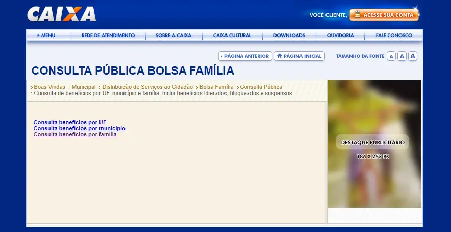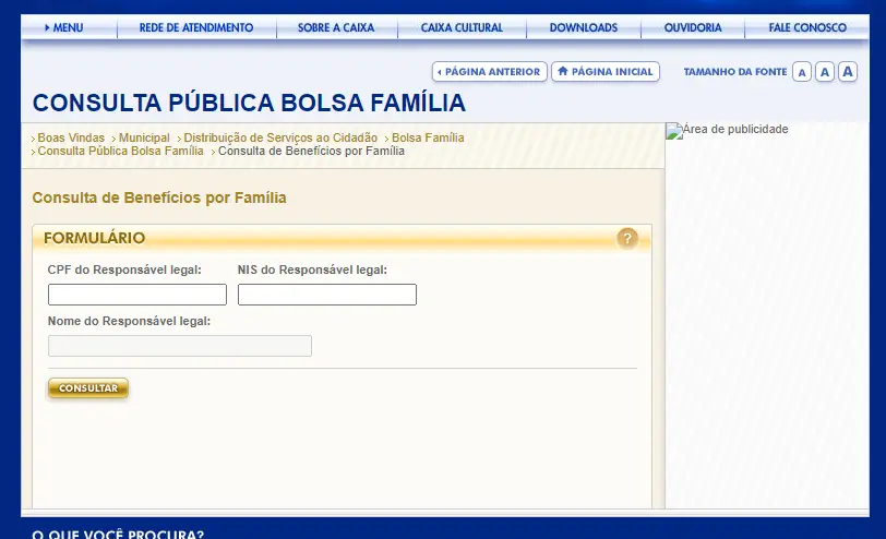 Então, para consultar o Bolsa Família pelo CPF o cidadão deve acessar a Consulta Pública Bolsa Família, sistema da Caixa Econômica Federal. Ao entrar no site se encontrará as seguintes opções de consulta ao benefício: